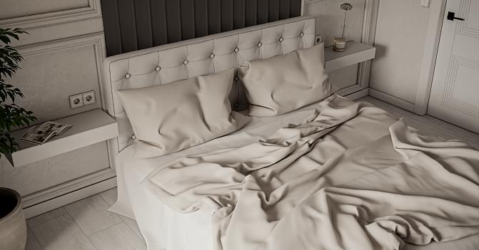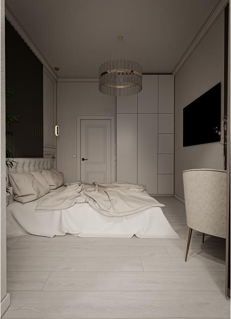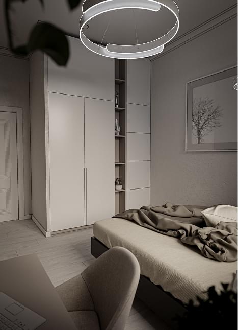 В спальне было реализовано несколько ключевых идей, направленных на создание максимального комфорта. Стена за кроватью оформлена мягкими панелями из текстиля, что не только улучшает акустику, но и создает ощущение уюта. Над кроватью установлены светильники. В спальне просторная и удобная гардеробная зона.