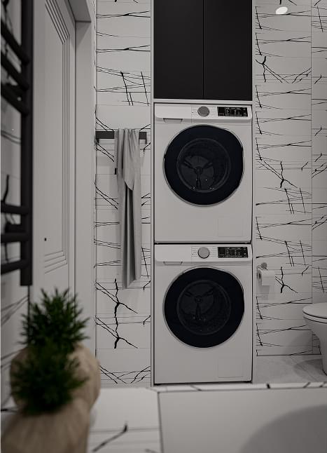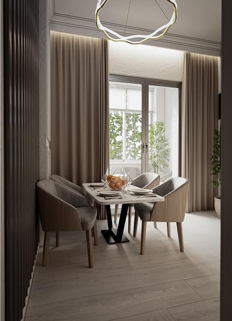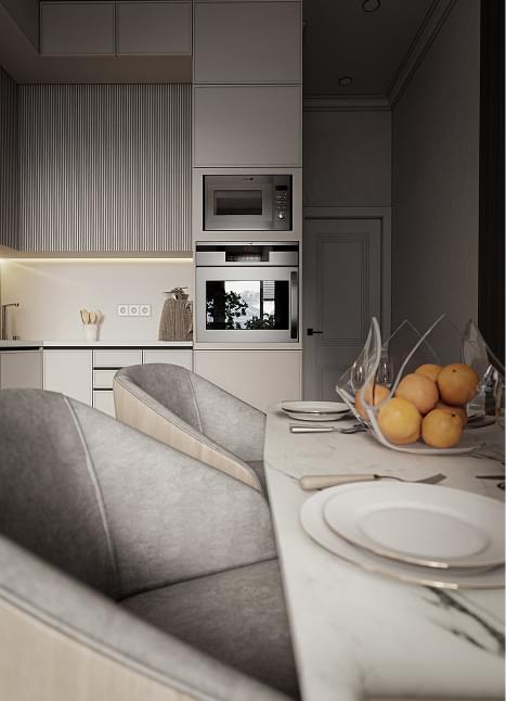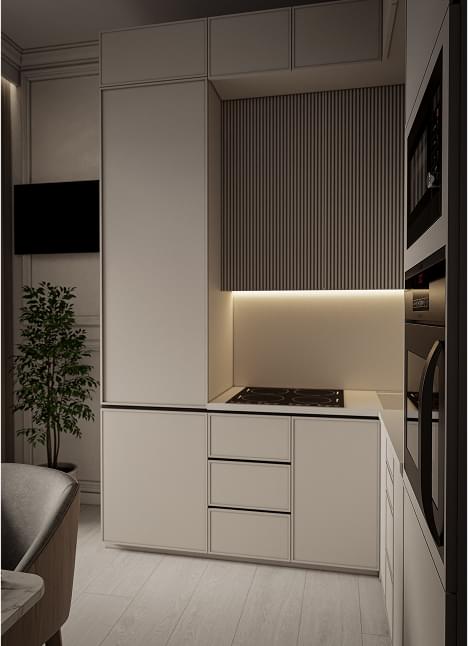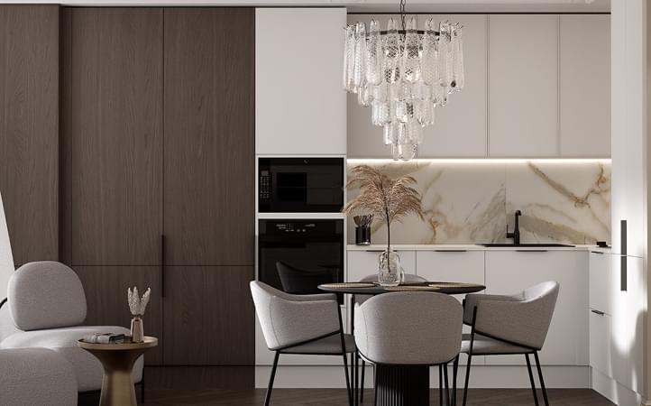 На кухне акцент был сделан на эргономику и умные технологии. Особое внимание уделено рабочей зоне, где установлены шкафы с выдвижными механизмами для удобного хранения посуды и техники. Встроенные кухонные приборы полностью интегрированы в фасады, создавая цельный и минималистичный вид. Под рабочей поверхностью организовано дополнительное освещение для комфортной готовки в вечернее время. Фартук с LED- подсветкой не только добавляет стиля, но и обеспечивает удобство в уходе.
